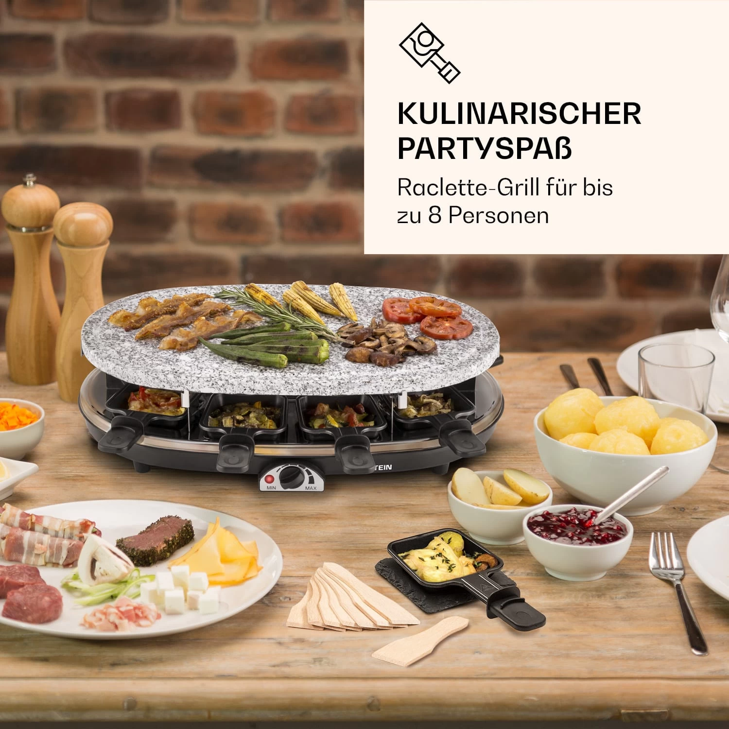 Tolle Abende in geselliger Runde genießen: Rund 8 Personen finden um den exklusiven Klarstein All-U-Can-Grill Raclette-Grill Platz und können dank den 8 mitgelieferten Pfännchen, Untersetzern und hölzernen Pfannenwendern maximalen Komfort beim Schlemmen genießen. Für besonderen Esprit in der Genießer-Runde sorgen die praktischen Untersetzer aus edlem Schiefer.
