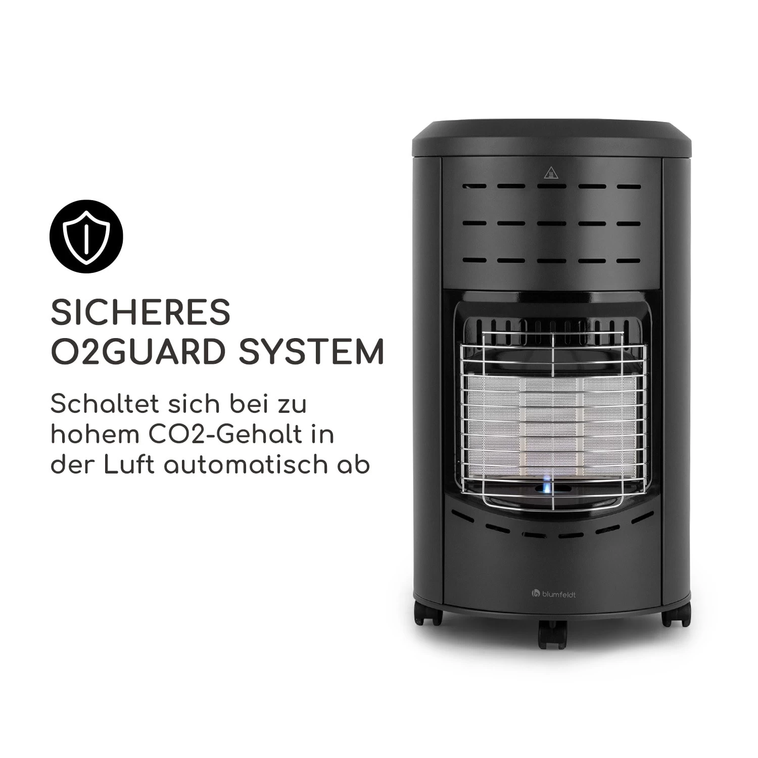 Der blumfeldt Andora Gasheizer beheizt ausgekühlte Wintergärten und Werkstätten genauso wie Garten- und Ferienhäuser. Im Inneren des Gehäuses finden Propan- oder Butan-Gasflaschen bis 11 kg ihren Platz und sind dank mitgeliefertem Schlauch und Druckminderer im Handumdrehen angeschlossen. Per elektrischem Piezo-System wird das Brennelement entzündet. Mit drei Heizstufen – 1600, 2600 oder 4200 Watt Leistung – sorgt es hocheffizient für schnelle Wärme. Für die nötige Sicherheit sorgt das O2Guard System: Es misst den Kohlendioxid-Gehalt in der Raumluft und schaltet den Gasheizer automatisch ab, wenn diese zu hoch ist. Seitliche Handgriffe sowie vier Bodenrollen ermöglichen das einfache Versetzen – so gelangt die Wärme genau dorthin, wo sie auch benötigt wird. Das lackierte Stahlblech-Gehäuse schützt das Gerät und verleiht dem blumfeldt Andora Gasbrennofen ein stilvolles Aussehen.