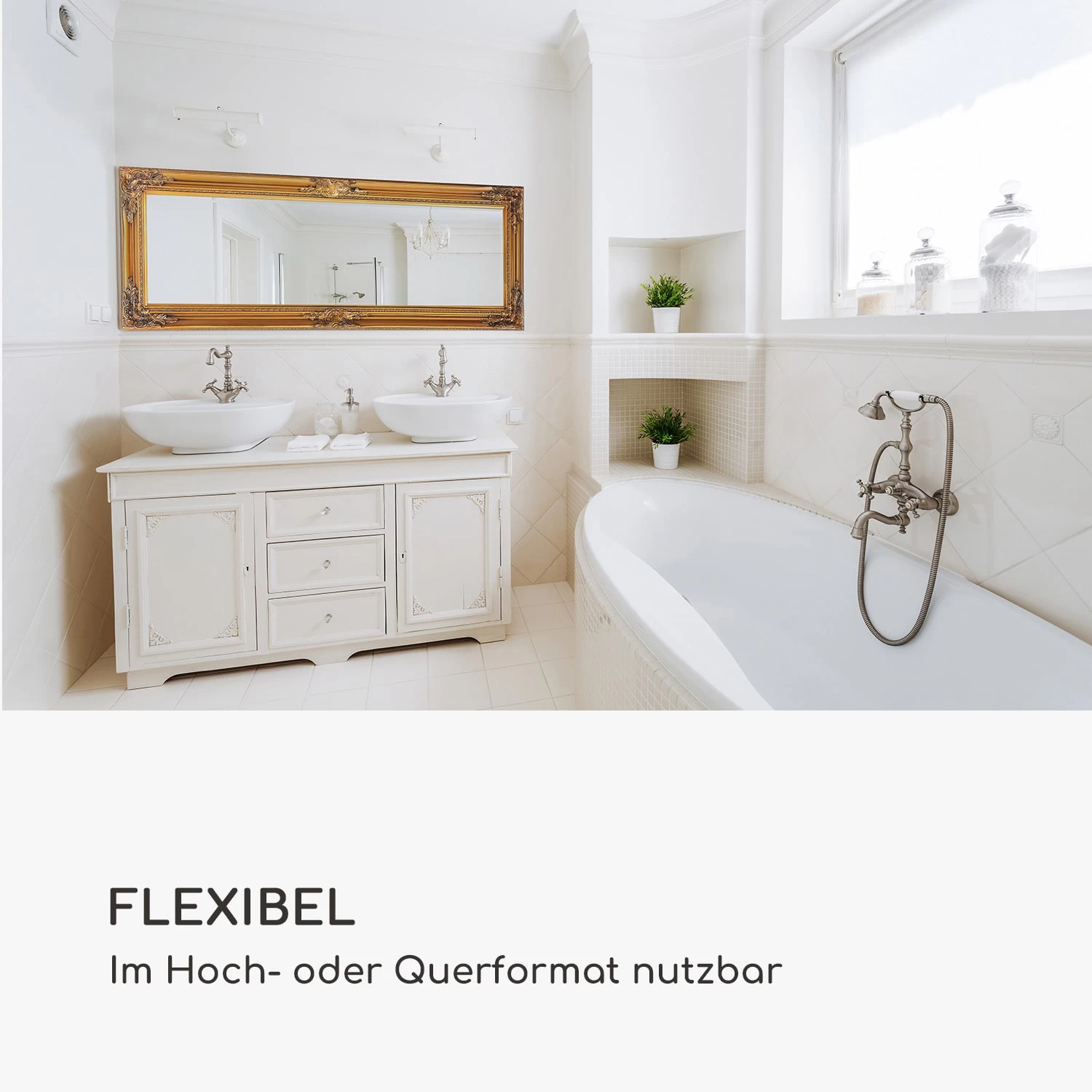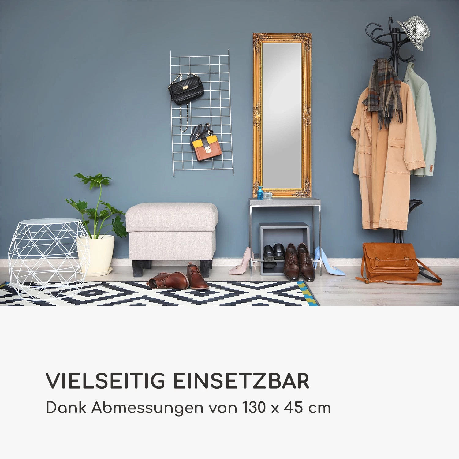 Durch einen Massivholzrahmen mit Gipsapplikationen verleiht der Ashford Standspiegel von Casa Chic by blumfeldt jedem deiner Räume einen besonderen visuellen Akzent. Mit seinem abnehmbaren Standfuß macht der Ashford nicht nur als Aufsteller, sondern auch aufgehängt jederzeit eine gute Figur. Der Spiegel mit Facettenschliff und Abmessungen von 130 x 45 cm ist besonders gut zur Verwendung im Hoch- oder im Querformat in Wohnzimmer, Badezimmer, Schlafzimmer oder auch im Flur geeignet.