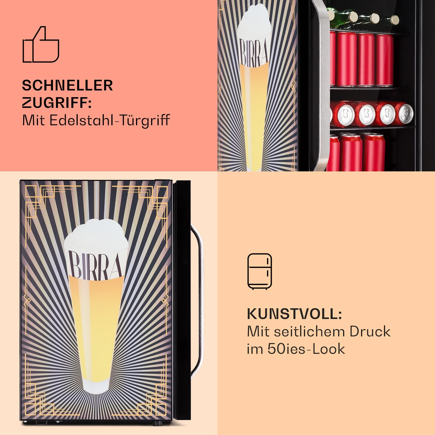 Gut gekühlt erfrischt besser: Der Klarstein Beersafe 70 ist ein kompakter Getränkekühlschrank mit einem Fassungsvermögen von 70 Litern. In der spritzigen Birra Edition erfrischt er seine Umgebung mit einem kühlenden Bier-Print und verleiht Küche oder Hobbyraum das Extra an Flair.