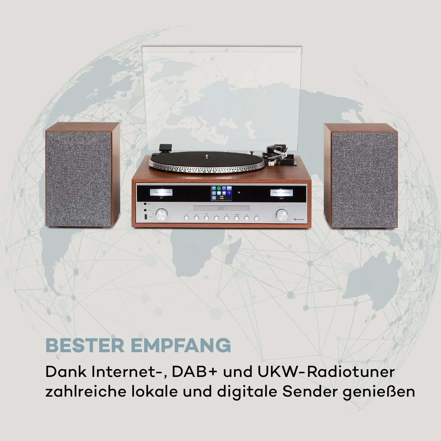 Im Mittelpunkt des auna Birmingham HiFi Stereo-Systems steht der unter einem Schutzdeckel verborgene Plattenspieler mit Riemenantrieb und zwei Geschwindigkeiten von 33 & 45 Umdrehungen pro Minute, der zusammen mit dem MP3-fähigen CD-Player den Dreh- und Angelpunkt das Gerätes bildet. Die Internet-, DAB+ und FM-Radiotuner empfangen neben lokalen Signalen zahlreiche digitale Sender aus der ganzen Welt in hoher Klangqualität und ohne Rauschunterbrechungen. Mit Hilfe der Bluetooth-Funktion können sämtliche Audio-Dateien von Smartphone, Tablet oder Laptop drahtlos und bequem über das Stereo-System wiedergegeben werden. Ein frontseitiger USB-Port ermöglicht darüber hinaus die problemlose Wiedergabe unzähliger MP3s. Ausgestattet mit 2 separaten Lautsprechern mit einer Leistung von 50 Watt max. (2 x 12,5 Watt RMS) beweist sich die auna Birmingham als überaus platzsparende HiFi-Komplettlösung, die sich unter anderem in Wohnbereichen mit beschränktem Platzangebot anbietet. Ein AUX-Eingang sowie ein Kopfhörer-Anschluss erweitern die Retro-Stereoanlage zudem um weitere nützliche Komponenten.