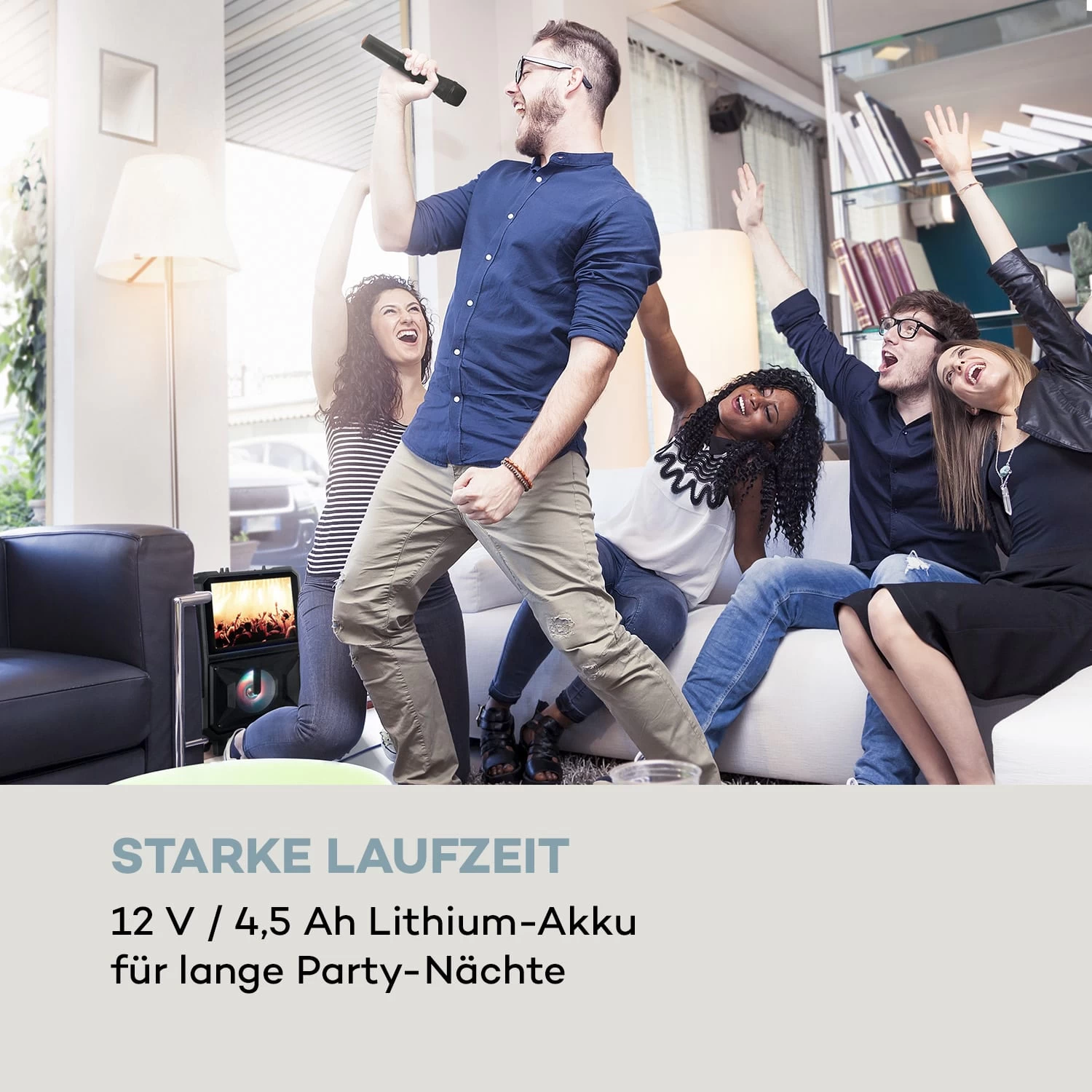 So geht gute Stimmung: Mit dem auna CenterStage 8 mobilen Karaoke-Lautsprecher sind höchste Gesangskunst, schräge Töne und beste Laune vorprogrammiert.