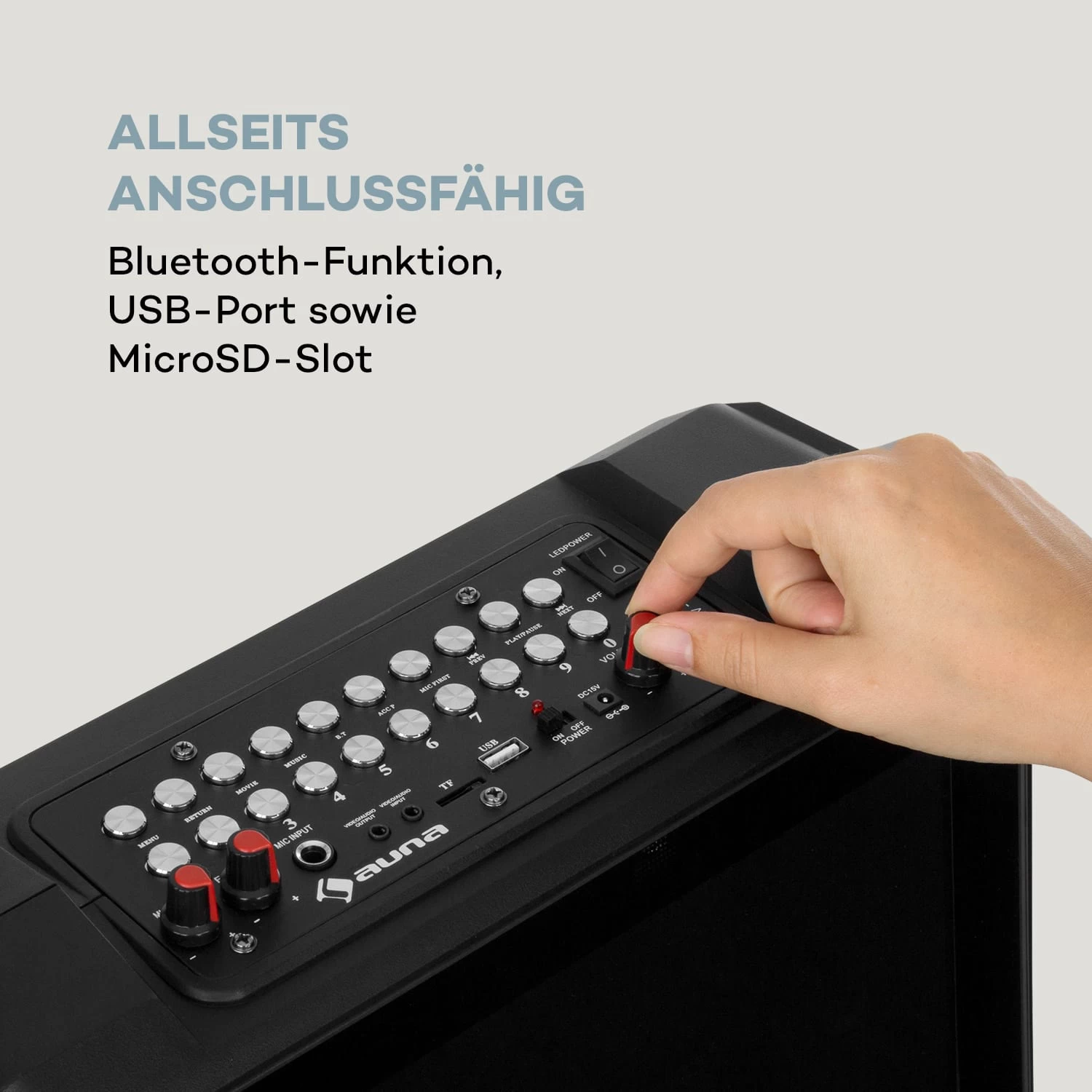 Ein mobiler Karaoke-Lautsprecher, von dem man nur in den höchsten Tönen spricht: Der auna CenterStage 8 mit extragroßem Display, vielen Anschlüssen und kabellosem VHF-Handmikrofon verwandelt jedes Event in eine ausgelassene Party!