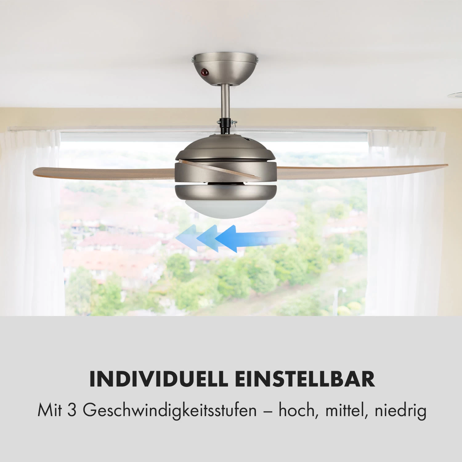 Mit einem Durchmesser von 52″ (132 cm), den 3 Geschwindigkeitsstufen hoch, mittel, niedrig und 180 Rotationen-pro-Minute setzt der Klarstein El Paso Deckenventilator auf Knopfdruck zuverlässig Luftmassen in Bewegung. Dabei bewegt er bis zu 10.344 m³ Luft in der Stunde. Seine drei robusten Flügel in Eichenholz-Optik, die je nach Wunsch zwei verschiedene Laufrichtungen einschlagen können, ermöglichen den Einsatz an warmen und kalten Tagen: Im Rechtslauf drückt er warme Luft von der Decke nach unten und hilft so beim Heizen im Winter. Im Linkslauf versorgt er dagegen das ganze Zimmer mit einem erfrischenden Luftstrom und verschafft dir Erleichterung an heißen Tagen. Eine integrierte Deckenlampe mit E27-Sockel bringt zudem Licht ins Dunkel und ermöglicht die platzsparende Installation direkt am vorhandenen Stromnetz. Darüber hinaus können viele Funktionen des El Paso direkt vom Boden per Fernbedienung gesteuert werden.