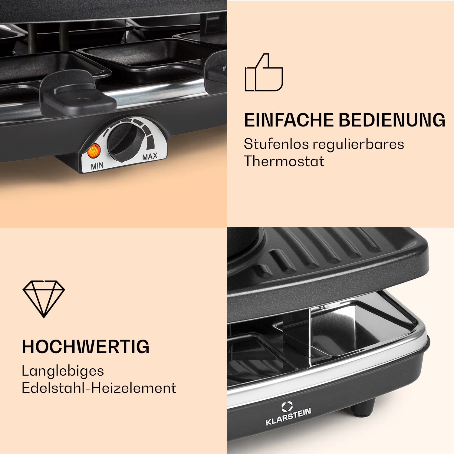 Verbindet, was zusammengehört: Der Klarstein Entrecôte Raclette-Grill kombiniert zwei Höhepunkte der geselligen Verköstigung in einem Gerät: Raclette und Fondue. Wer sich gerne Freunde nach Hause einlädt oder mit der eigenen Familie ein unkompliziertes und doch erlebnisreiches Essen genießt, der weiß die gemütliche Runde beim Fleisch- oder Käsefondue oder beim Raclette zu schätzen. Der Entrecôte Tischgrill bietet die optimale Ausstattung für vielfältige kulinarische Ereignisse in den eigenen vier Wänden für bis zu 8 Personen.