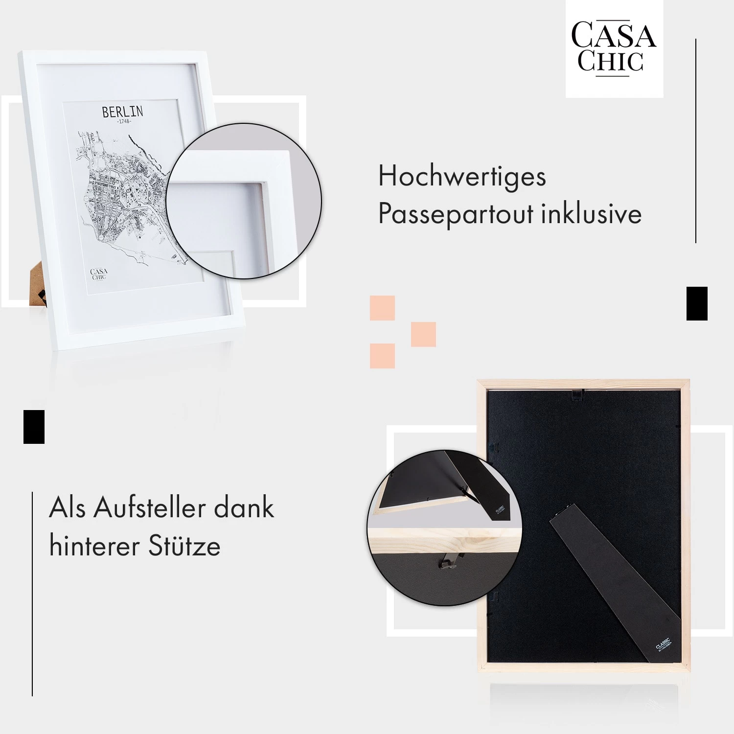 Der ansprechende Everton Bilderrahmen von Casa Chic by blumfeldt aus Echtholz bringt deine DIN-A3 großen Fotos und Bilder sowohl im Hoch- als auch im Querformat ideal zur Geltung. Bleibe flexibel und gestalte wunderschöne Wandcollagen oder arrangiere deine Lieblingsfotos auf dem Sideboard oder im Regal. Das mitgelieferte Passepartout überlässt dir die Wahl des passenden Bildausschnitts im DIN-A4-Format. Ein schlichtes Rahmenprofil und die Frontscheibe aus Acrylglas sorgen für Eleganz und besten Schutz.