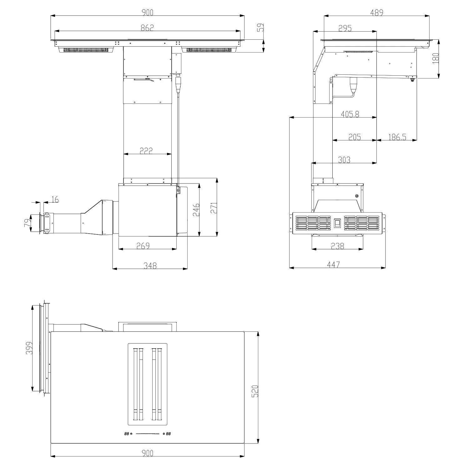 - Maße Kochfeld gesamt: ca. 90 x 30 x 52 cm (BxHxT)