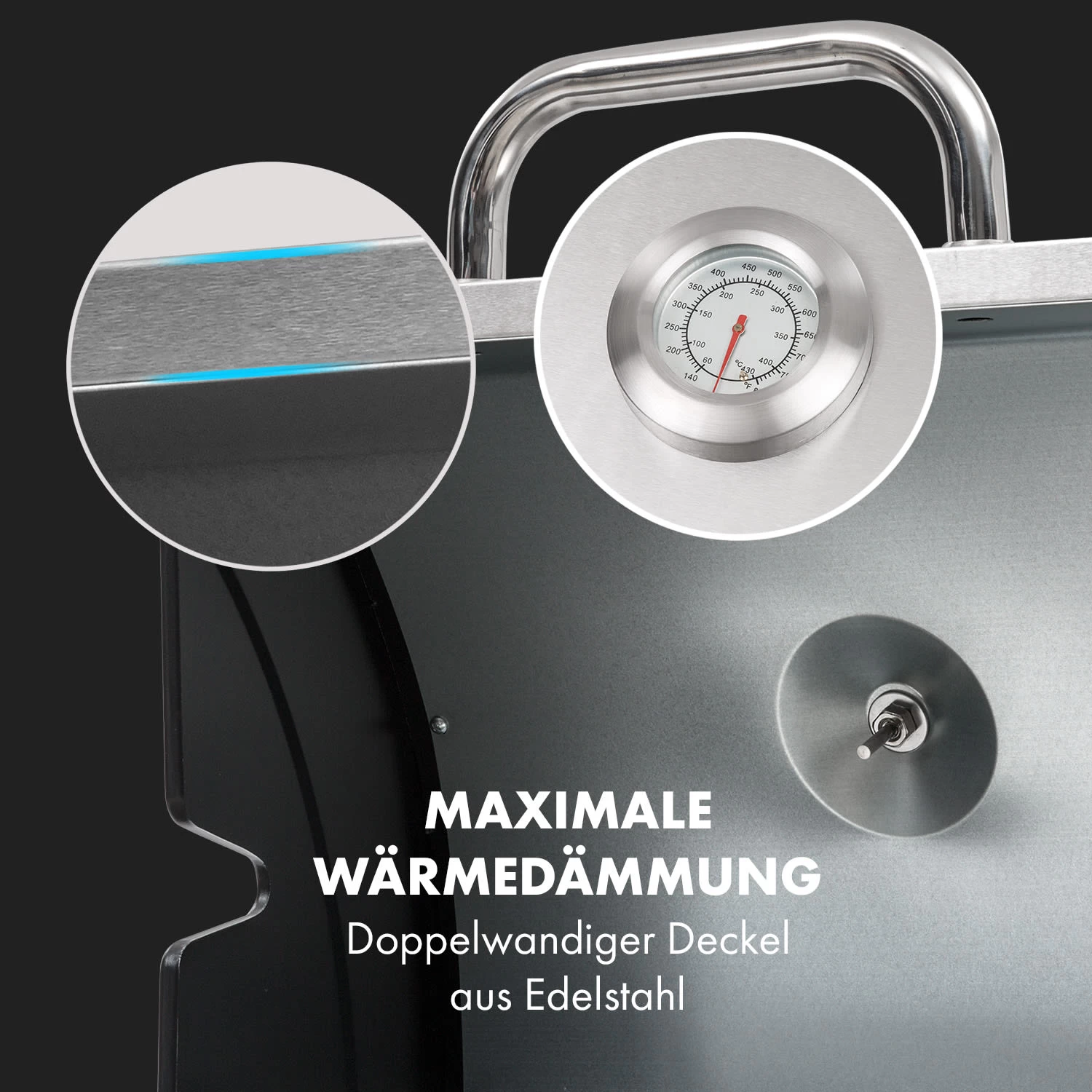Nach dem Anschluss einer Gasflasche sorgt die Piezo-Zündung für einen schnellen Start des Brenners: Ein Drücken des Drehknopfes genügt, schon ist der BBQ Grill betriebsbereit. Die enorme Gesamtleistung von 6 kW mit 2 x 3 kW Edelstahlbrennern sorgt dafür, dass verschiedenste Speisen besonders gut zubereitet werden können. Auf dem gusseisernen Grillrost werden speziell Steaks und andere Fleischspezialitäten hervorragend auf den Punkt gegrillt: Durch die hohen Temperaturen gelingt das Fleisch außen kross und innen zart. Die Hitze wird durch das doppelwandige Edelstahlgehäuse des Deckels besonders gut im Innern gehalten, ein Thermometer gibt verlässlich Auskunft über die aktuelle Temperatur.