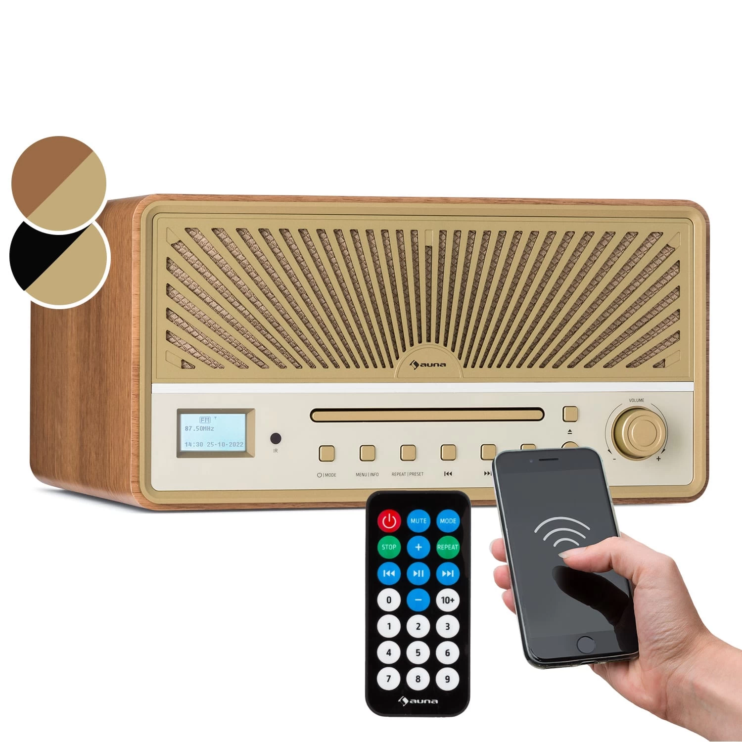 Mit dem auna Glastonbury DAB Radio mit CD-Player erlebst du einen modernen Weltempfänger, welcher dank beeindruckendem Retro-Design deinen Wohnraum verschönert. Egal ob Rock, Pop, Jazz, Klassik oder spannende News aus der ganzen Welt – mit dem Glastonbury bist du immer auf Empfang – glasklar in digitalem DAB-Sound oder ganz klassisch als Kurzwellenempfänger. Daneben kannst du über das Gerät auch deine gesamte CD-Sammlung abspielen und andere Audiowiedergabe-Geräte wie PC, Laptop oder Smartphone anschließen. Dafür verfügt das kompakte Radio rückseitig über einen Line-In-Anschluss sowie einen USB-Port: Einfach deinen USB-Stick anschließen und deine Lieblingsmusik im MP3-Format genießen.