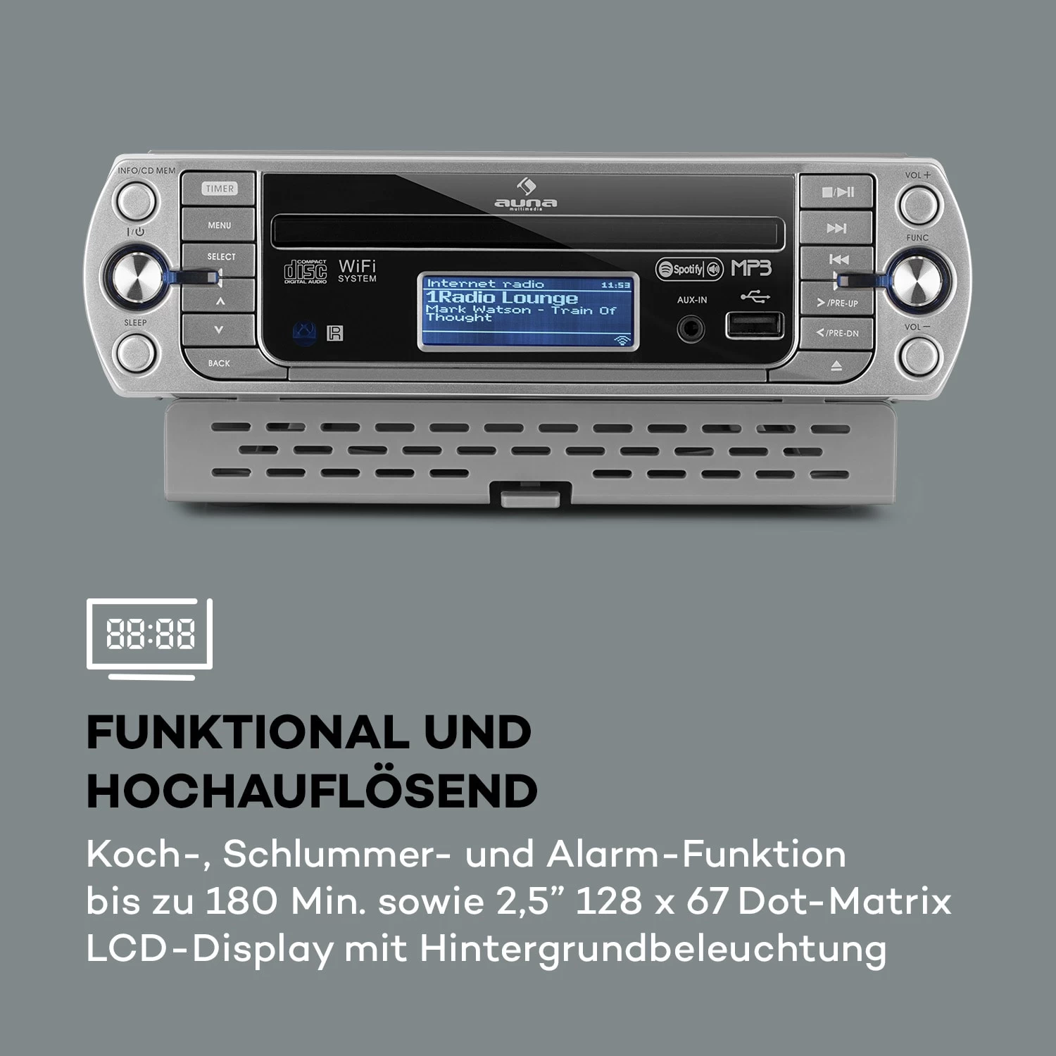 Das auna KR-500 CD Küchenradio im handlichen Format ist aus vielen Haushalten nicht mehr wegzudenken und verspricht dank vielzähliger Funktions- und Wiedergabemöglichkeiten allzeit beste Unterhaltung. Das leistungsfähige Internet/PLL FM Radio kann durch seine kompakten Maße und eine smarte Unterbauvorrichtung platzsparend unter Küchenschränken und -Regalen angebracht und im Desktop-Modus aufgestellt werden. Die vielseitige Klang-Box empfängt bis zu 10.000 Sender und verfügt über integriertes WiFi, einen klassischen CD-Player, einen USB-Anschluss zur MP3-Wiedergabe sowie über einen Aux-Eingang. Besonders hervorzuheben ist die Spotify Connect-Funktion, durch die das Radio als drahtloser Lautsprecher über die Spotify-App kontrolliert werden kann, während das Network-Streaming die Wiedergabe im UPnP- und DLNA-Standard gewährleistet. Außerdem lässt sich das Gerät über die UNDOK-App und eine Fernbedienung bequem im Sitzen bedienen und bietet zu Erinnerungszwecken eine Koch-, Schlummer-, und Alarmfunktion mit einer Gesamtzeit von bis zu 180 Minuten. Das 2,5″ 128 x 67 Dot-Matrix LCD-Display mit Hintergrundbeleuchtung hält Sie zudem durch die Anzeige der je aktuellen Musikwiedergabe zu jeder Tages- und Nachtzeit zuverlässig auf dem Laufenden.