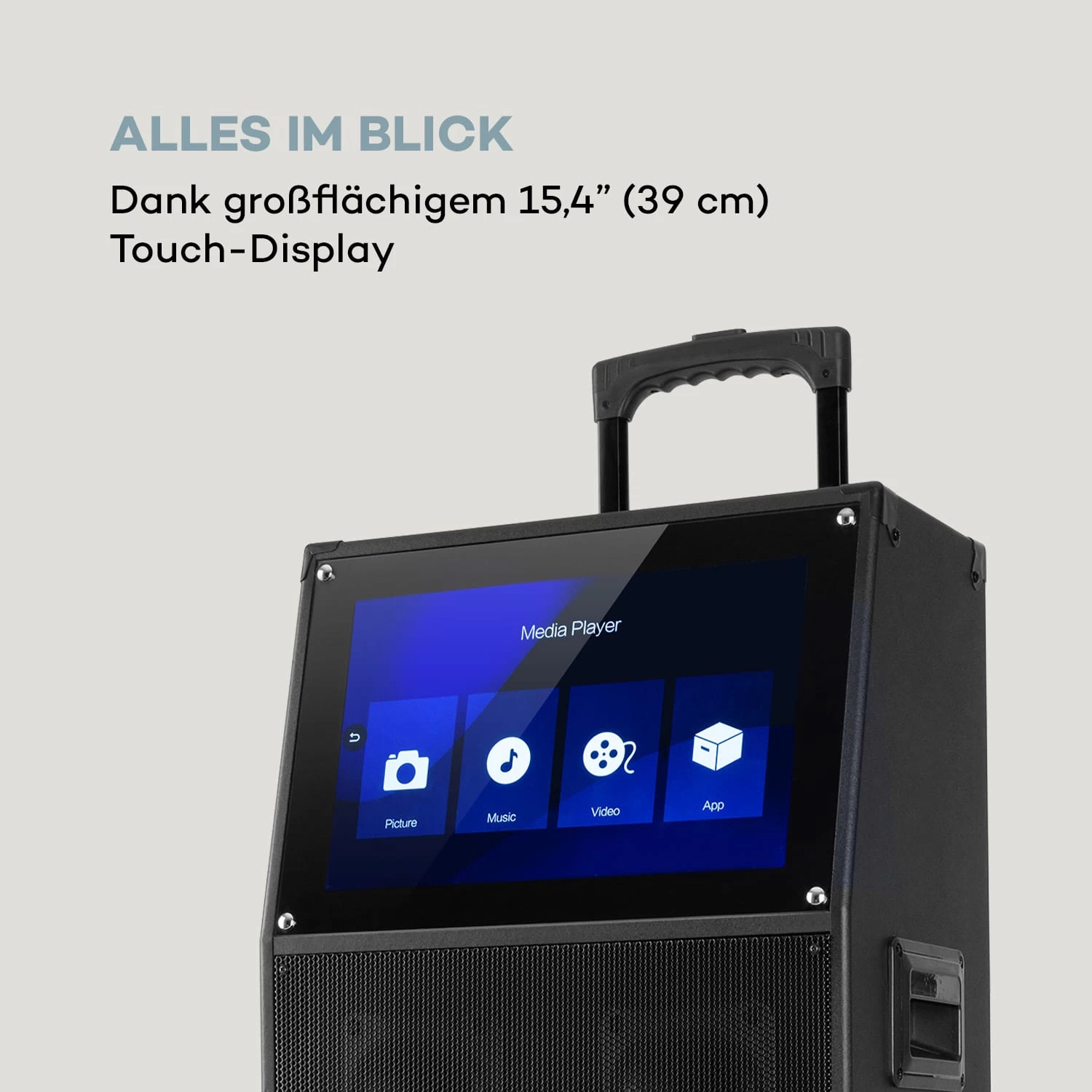 Das auna Pro KTV Karaoke-System ist dank Trolley-Funktion, einem großen Touch-Display, 2 drahtlosen UHF-Mikrofonen und einem langlebigen 12V/12A Akku das ideale Gerät für alle Karaoke-Liebhaber.