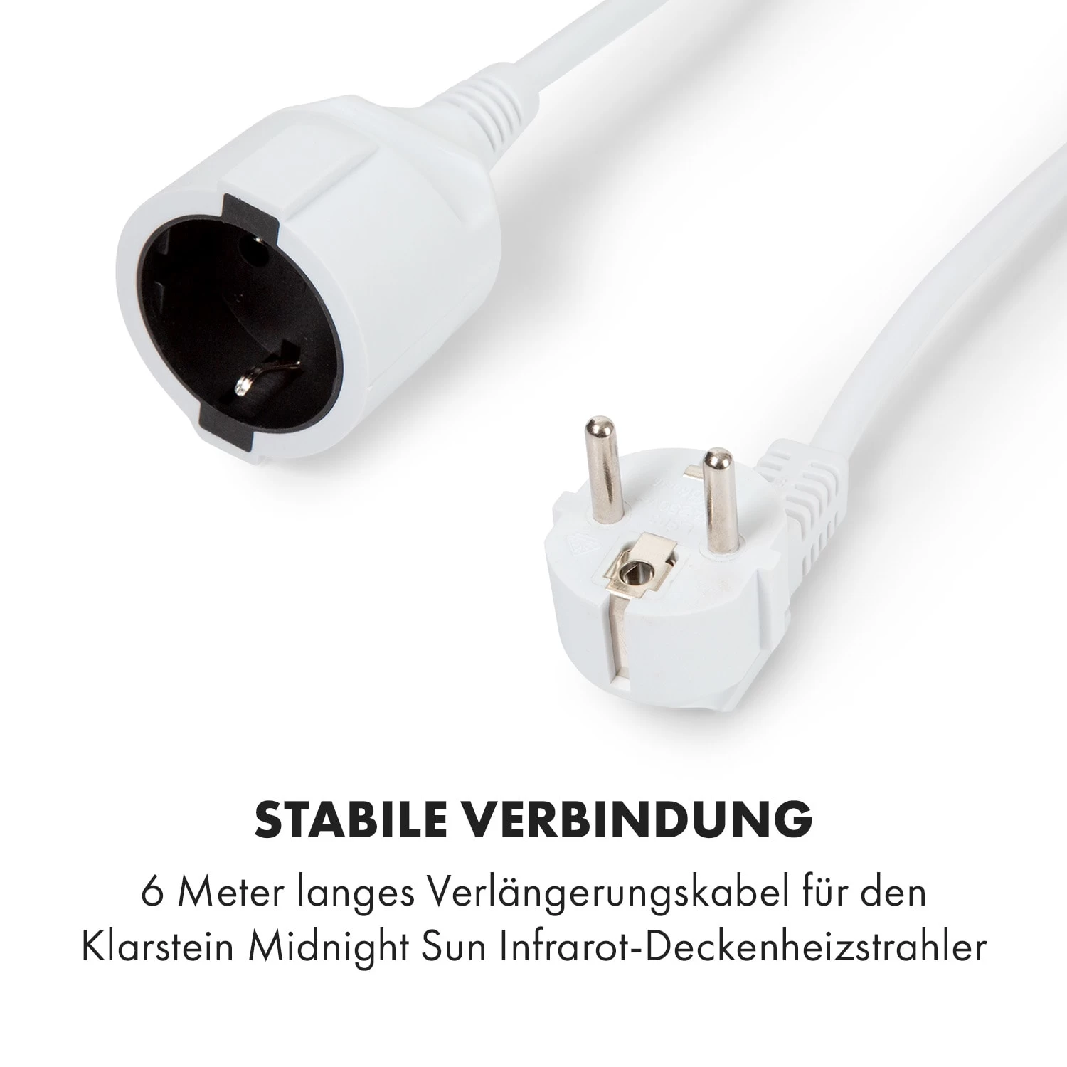 Das 6 Meter lange Verlängerungskabel ermöglicht die bequeme Stromversorgung der Klarstein Midnight Sun Decken-Infrarotheizung und sorgt für eine Gesamtlänge von ca. 10 Metern vom Gerät bis zur Steckdose.