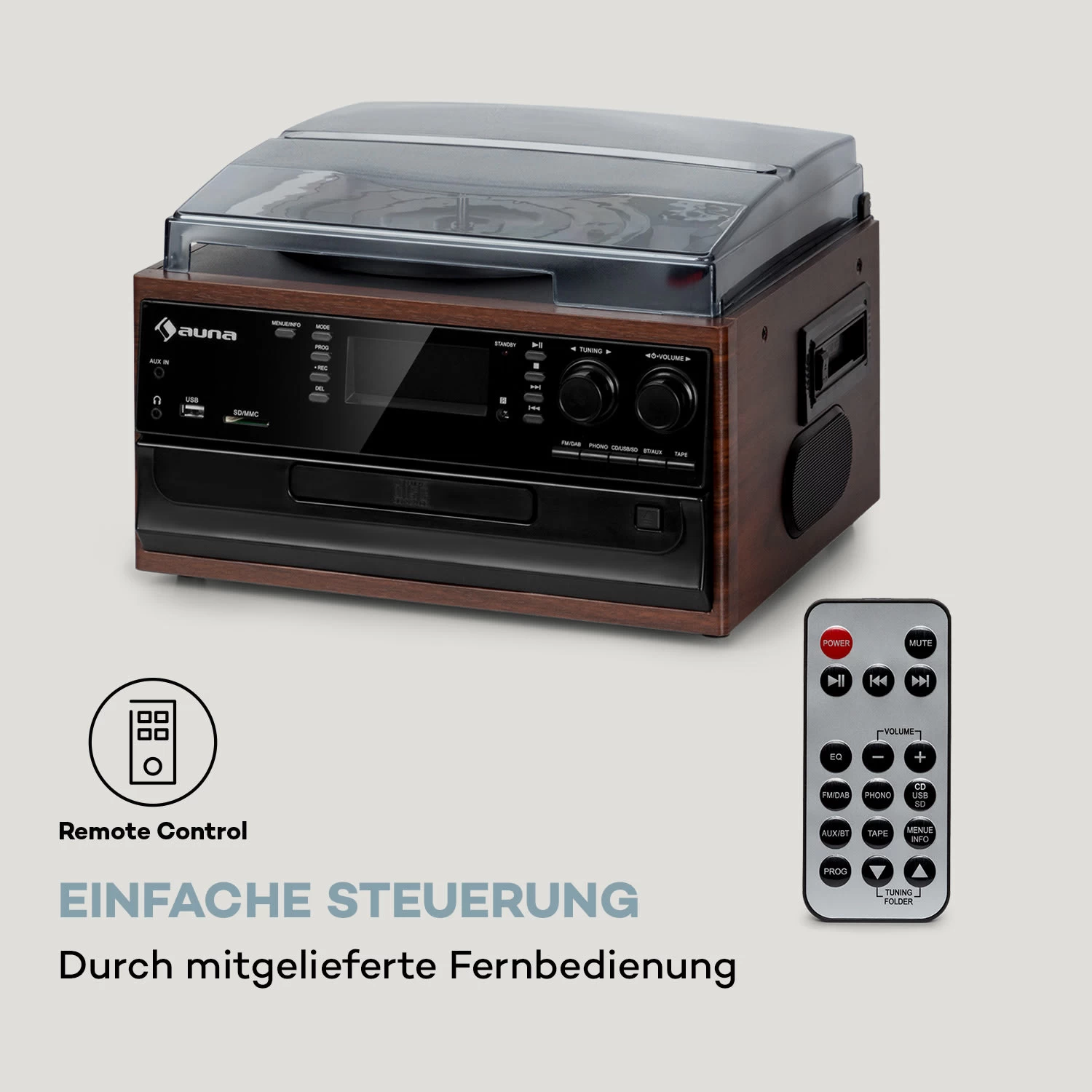 Den Mittelpunkt der Retro-Stereoanlage bildet der unter einem Schutzdeckel verborgene Plattenspieler, der zusammen mit dem seitlich verbauten Kassettendeck und dem MP3-fähigen CD-Player alle musikalischen Leitmedien seit dem frühen 20. Jahrhundert abdeckt. Ein Plattenspieler mit einem Riemenantrieb und drei Geschwindigkeiten von 33, 45 & 78 Umdrehungen pro Minute hält die auna-Stereoanlage somit ebenso in der täglichen Rotation, wie Kassetten und CD-Medien. Seine Anschlussfähigkeit an moderne Mediengewohnheiten bezeugt das Gerät mit frontseitig verbauten USB- und SD-Anschlüssen, mit deren Hilfe die Tonspuren von Kassette, CD oder Platte ohne viel Aufhebens direkt als MP3-Datei auf USB- bzw. SD-Datenträgern aufgezeichnet werden können. Auf dem Weg in die Zukunft begegnet man einem FM/DAB+ Radiotuner, der neben lokalen Signalen auch digitale Sender in hoher Klangqualität und ohne Rauschunterbrechungen empfängt. Vollkommen in der Moderne angekommen fühlt man sich jedoch erst mit der Bluetooth-Funktion, durch die sämtliche Audio-Dateien von Smartphone oder Tablet drahtlos und bequem über die auna Oakland DAB Retro-Stereoanlage wiedergegeben werden können. Dank ihrer vielen Funktionen und integrierten Lautsprechern erweist sich die auna Oakland DAB Retro-Stereoanlage als überaus platzsparende HiFi-Komplettlösung, die sich gerade auch in Wohnbereichen mit beschränktem Platzangebot wohlfühlt. Die integrierten Stereo-Lautsprecher der auna-Mikroanlage zeichnen dabei ein aussagekräftiges Klangbild, das sich über den Line-Ausgang Rückendeckung bei einem externen HiFi-Verstärker holt.