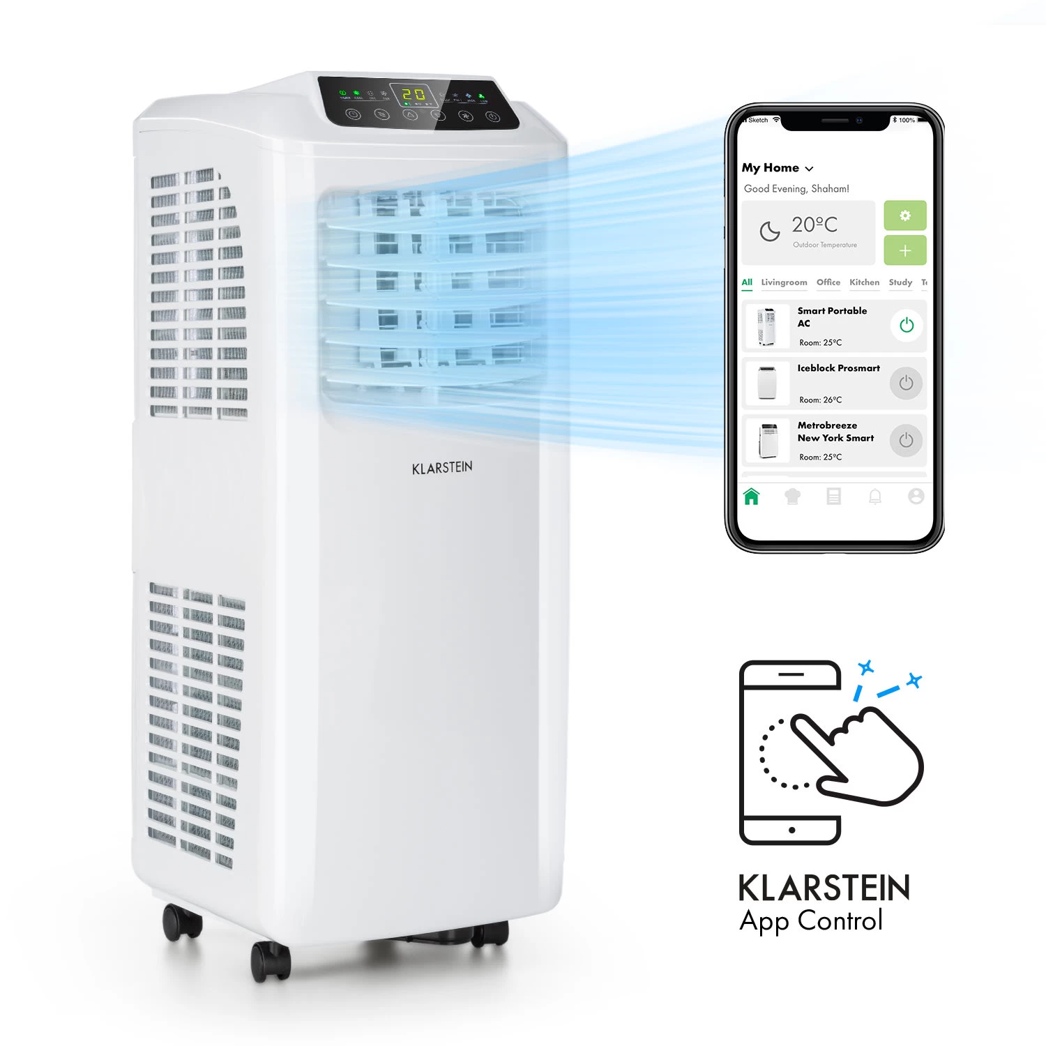 Die Klarstein Pure Blizzard Smart 9k Klimaanlage sorgt für klare, gekühlte Raumluft an heißen Sommertagen und ermöglicht dank Ventilator und Luftentfeuchter jederzeit ein angenehmes Raumklima. Dabei trumpft das Gerät mit einem leistungsstarken aber dennoch sparsamen Kompressor zur Luftkühlung auf. 9000 BTU / 2,6 kW Kühlleistung bzw. entsprechende 1010 Watt Leistungsaufnahme tragen dem Pure Blizzard Smart 9k die Energieeffizienzklasse A ein und machen ihn zum geeigneten Dauerbetriebsgerät für Räume von 26 bis 44 m² Größe. Wähle eine Zieltemperatur von 17 bis 30 °C und steuere deine Klimaanlage auf Rollen bequem über die Klarstein-App deines Smartphones, mit der Fernbedienung oder manuell am topseitigen Bedienfeld. Die Timer-Funktion ermöglicht dir das vorprogrammierte Nachhausekommen in gekühlte Räume.