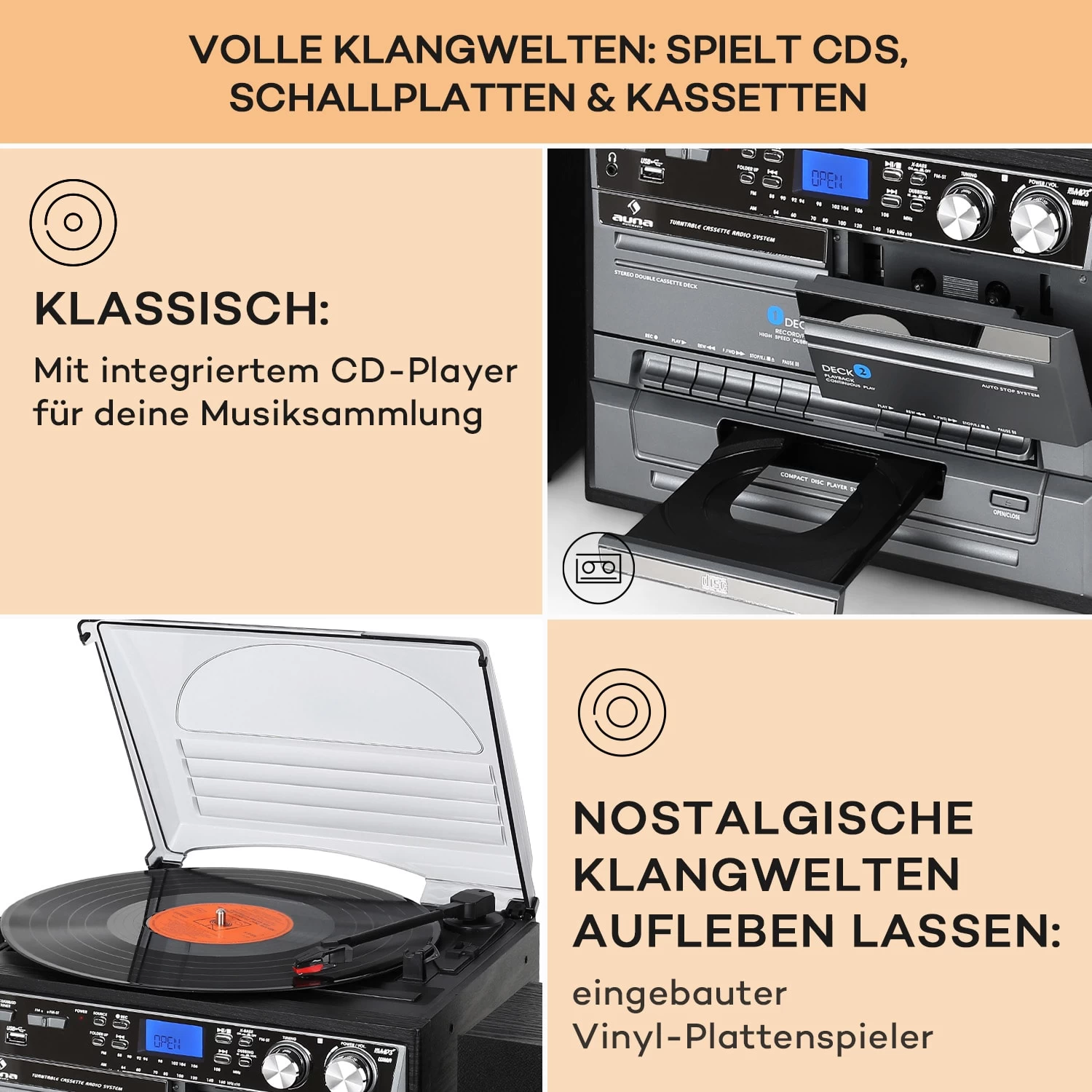 Dank integriertem Plattenspieler und Doppel-Kassetten-Deck samt Aufnahme-Funktion bleiben auch Langspielplatten und Kassetten in der Rotation. Sollen diese anfälligen Medien einer archivarischen Verwendung zugeführt werden, besteht die Möglichkeit die Vinyl- und Kassetten-Tonspur als MP3 auf ein USB- oder SD-Medium aufzunehmen.