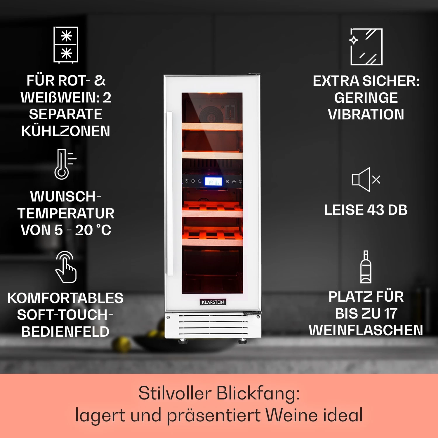 Edles Design und farbige Präsentation: Der Klarstein Vinovilla 17 Built-In Duo Doppelzonen-Weinkühlschrank passt dank Slim-Design in nahezu jede Lücke! Seine zwei Zonen kannst du separat temperieren, was dir eine zeitgleiche Kühlung und Lagerung von Rot- und Weißweinen ermöglicht. Aber auch Champagner, Schaumweine, Sekt oder andere delikate Tropfen lagern im Weintemperierer langfristig optimal. Neben besten Lager- und Kühlungsverhältnissen bietet er deiner Weinsammlung eine extravagante Bühne: Hinter Glas präsentieren sich die Flaschen wunderbar – rot, blau oder weiß beleuchtet.
