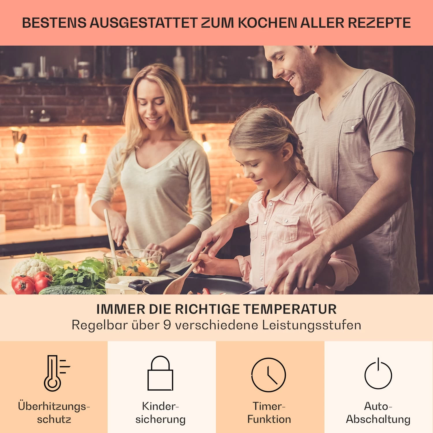 - Boost-Funktion: Leistungssteigerung um 300 W bei jeder Kochzone für schnelleres Erhitzen