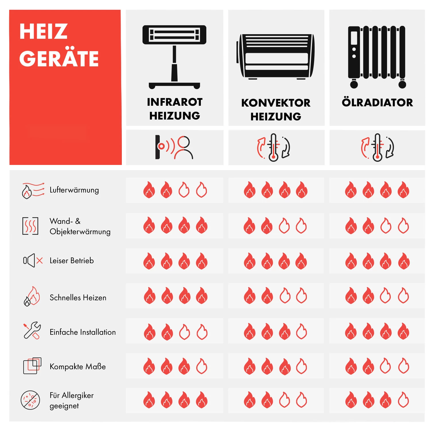 - Infrarotwärme: erwärmt angestrahlte Personen und Gegenstände, keine direkte Luftaufheizung