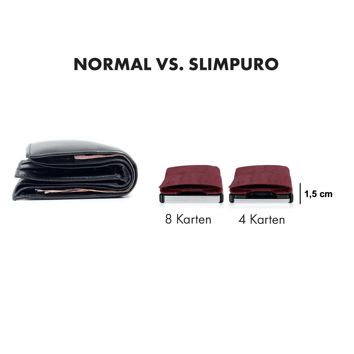 Keine Lust mehr auf große, unhandliche und unsortierte Portemonnaies? Mit dem ZNAP Slim Wallet von slimpuro schrumpft deine Geldbörse auf 8 x 1,5 x 6 cm (BxHxT) zusammen. Natürlich hast du weiterhin Platz für bis zu 8 Karten sowie Geldscheine und Münzen. Das Mini-Portemonnaie mit seinem robusten Case aus Aluminium und einer RFID Schutz Karte schützt deine Bankkarten vor Datendiebstahl. Im hochwertigen Geldscheinfach finden – ungefaltet – Banknoten bis 200 Euro Platz. Mit seinen vielen unterschiedlichen Farben und Designs findet jeder sein passendes ZNAP Slim Wallet.